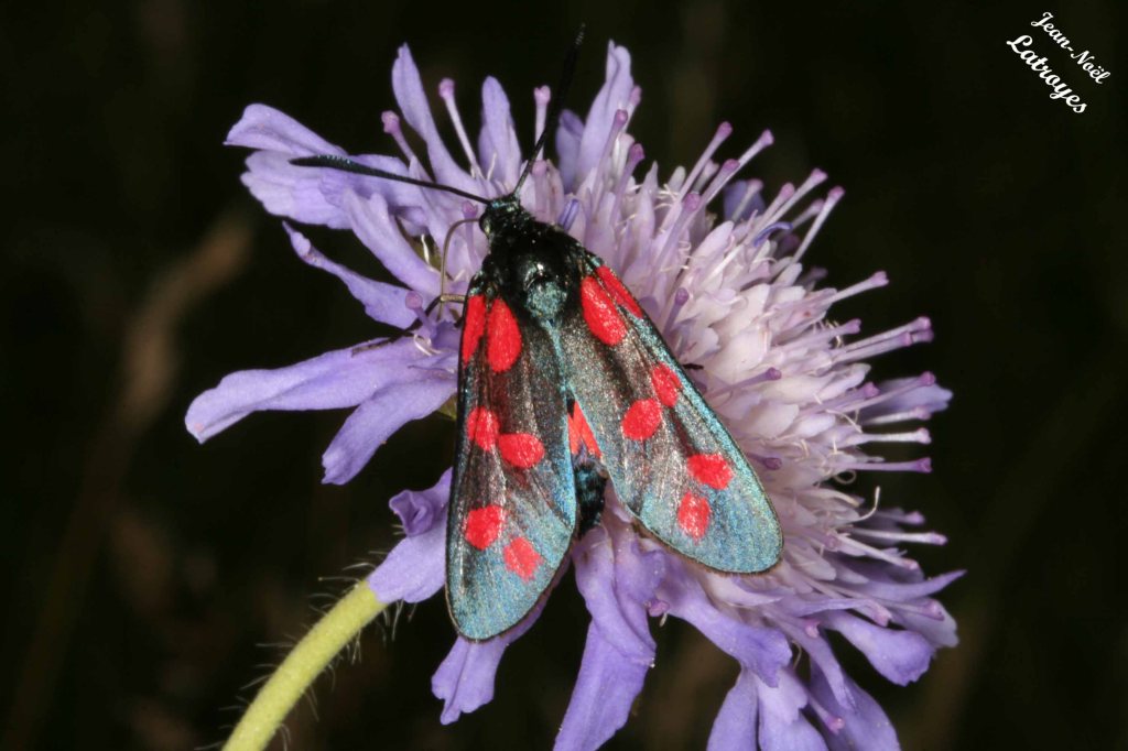 Zygène de la filipendule Zygaena filipendula Famille des Zygaenidae Znieff des Genevriers, vers les Foulenots (Filain). 22 juillet 2007. Arguments d’identification : Tache n° 6 sur l’aile antérieure présente. Taches 3 et 4 séparées. Bordure noire sur l’aile postérieure non visible.